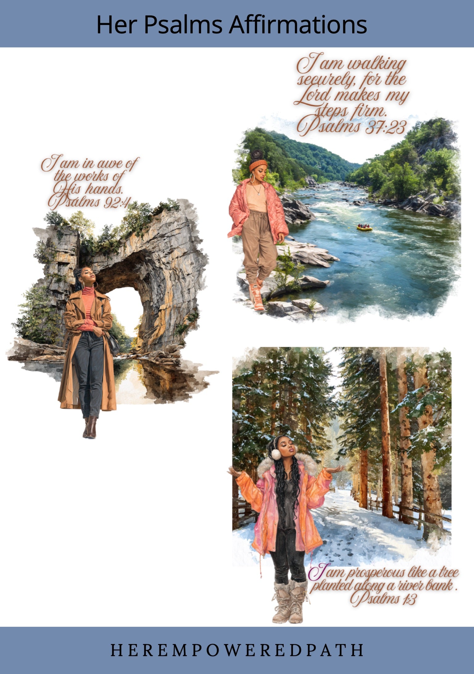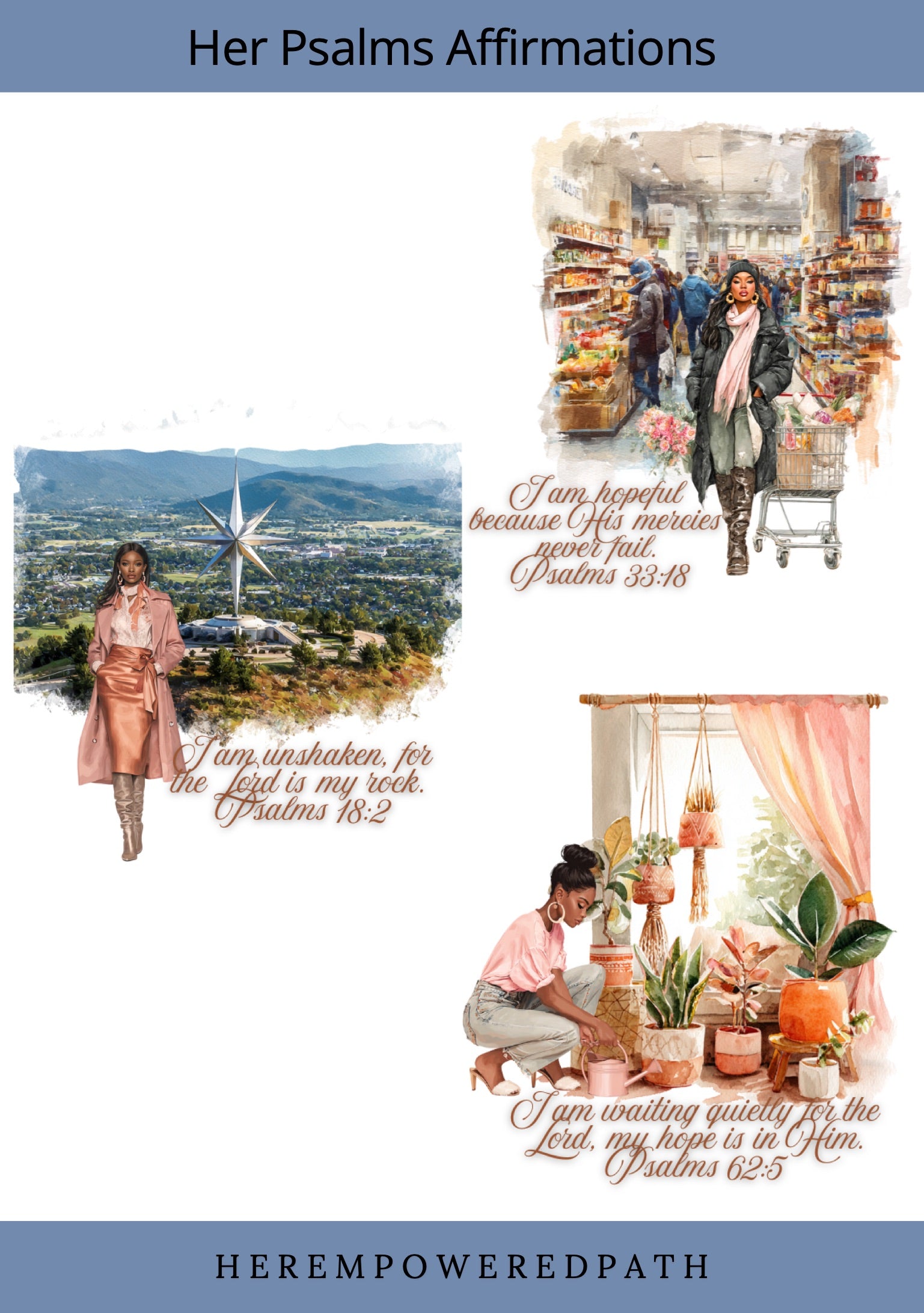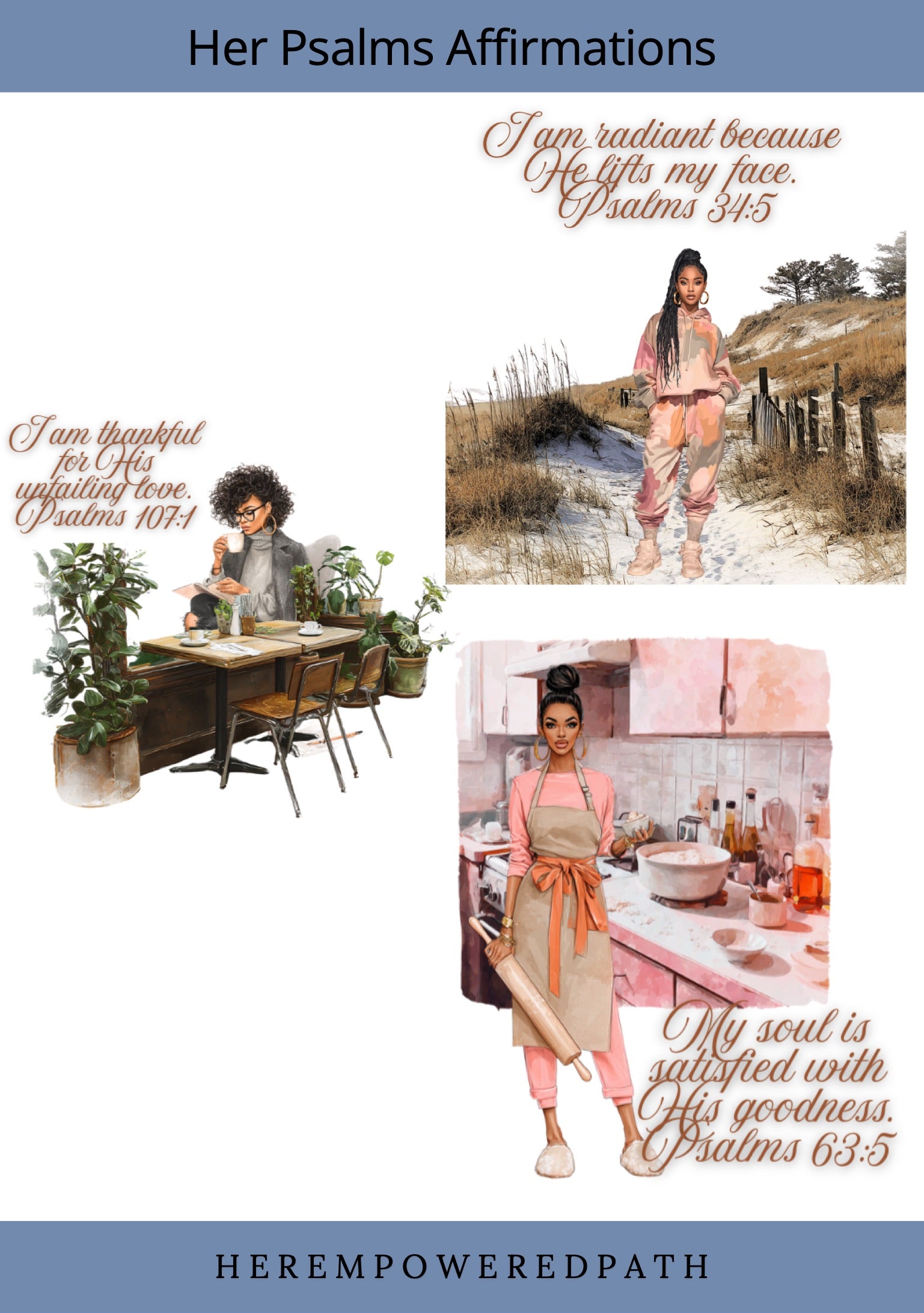 Bring peace, faith, and beauty into your digital planning with the Her Psalms Affirmations Sticker Collection 🌸✨. This set features 24 beautifully designed transparent PNG stickers and a pre-cropped GoodNotes file, all inspired by the timeless affirmations found in the Book of Psalms. Each sticker showcases a stunning Black woman styled in cozy luxe fashion, paired with uplifting Psalm-based affirmations to remind you of God’s love and promises.